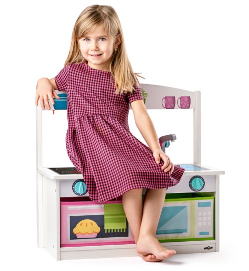Lavice s úložným prostorem pro hračky je zároveň i kuchyňkou s otočnými knoflíky a vodovodní baterií, která se upevní na vrchní desku pomocí magnetu. Obsahuje: 3 dílky. Rozměr: 59 x 31,5 x 58 cm. Výška pracovní desky: 28,5 cm. Věk: 3+