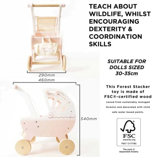 Povozte panenku v krásném tradičním kočárku! Roztomilý design, krásné detaily ve formě srdíček a krajek. Kočárek v pastelově růžové, krémové a bílé barvě má silnou strukturu, měkkou matraci a jedinečný baldachýn, který je ručně šitý a zatažitelný. Stylová jízda pro všechny druhy panenek! Hračka je vyrobena z kvalitních materiálů, kolečka z přírodního kaučuku jsou pogumována, jízda po koberci i tvrdé podlaze tak bude hladká. Nechybí ani samostatná roztomilá přebalovací taška. Perfektní hračka, kterou si můžete předávat z generace na generaci. Hračky s účelemVšechny hračky firmy Le Toy Van jsou vyrobeny s cílem – aby dlouho vydržely. Designovány s láskou zkušenými řemeslníky za použití etických praktik a udržitelných materiálů, které jsou laskavější k naší planetě. Hlavní vlastnosti: vyrobeno eticky z udržitelného dřevatestováno dle nejpřísnějších standardůmalováno netoxickými barvami na bázi vodyinspiruje k představivé hřerozvíjí kognitivní dovednostivhodné pro panenky a plyšáky ve velikosti 30-35 cm Ocenění hračky:Loved By Parents Shortlisted Award 2018 Honeybake kolekce: Hračky v této kolekci jsou vhodné k objevování, pomohou dětem s rozvojem představivosti, sociálních a verbálních dovedností a kognitivních funkcí. Tradiční design s moderními detaily děti jistě bude bavit. Honeybake je kolekce Le Toy Van, která vyhrála nejvíce ocenění, a to za design, kvalitu, bezpečnost a také za vzdělávací a herní hodnotu. Značka a certifikát FSC® (Forest Stewardship Council) zaručuje, že dřevo, ze kterého byl produkt vyroben, nebylo vytěženo nelegálně a pochází z lesů obhospodařovaných šetrným či přírodě blízkým způsobem, ve kterém jsou dodržovány přísné environmentální a sociální požadavky. Značka FSC® na výrobku znamená, že svým nákupem pomáháte chránit lesy a podporujete šetrné, odpovědné či přírodě blízké hospodaření, díky kterému jsou naše lesy stabilnější, zdravější, mají přirozenou druhovou skladbu a lépe odolávají negativním následkům klimatických změn.