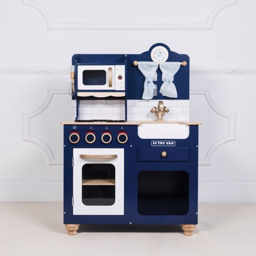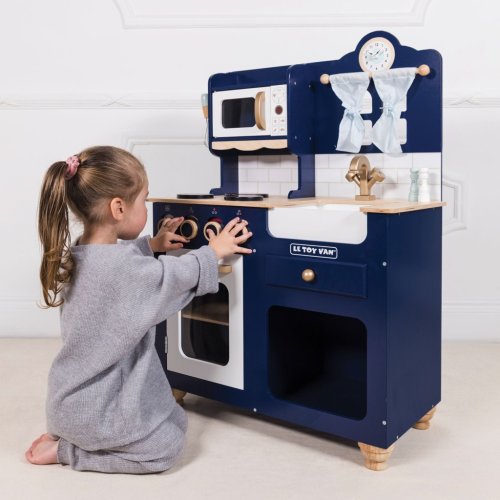Kuchyňka Oxford je vyrobena z pevného a udržitelného dřeva, originální design z ní dělá unikátní kousek. Je malována v odstínu královské modři, její detaily jsou v barvě mědi. Tato tradiční hračka se bude hodit do každého dětského pokoje, děti nadchne k představivé hře na role. Mezi její funkce patří otevíratelné dveře trouby, otočné knoflíky, dřez, mikrovlnka, roztomilé okno se závěsy a hodiny s otočnými ručičkami. V balení najdete také metličku, vařečku, solničku a pepřenku. Vše pro malé šéfkuchaře a šéfkuchařky. Kuchyňku můžete dovybavit jídlem a doplňky z kolekce Honeybake od Le Toy Van. Krásná hračka, kterou si můžete předávat z generace na generaci. Hračky s účelemVšechny hračky firmy Le Toy Van jsou vyrobeny s cílem – aby dlouho vydržely. Designovány s láskou zkušenými řemeslníky za použití etických praktik a udržitelných materiálů, které jsou laskavější k naší planetě. Hlavní vlastnosti: dřevěná kuchyňka s doplňkyvyrobeno eticky z udržitelného dřevatestováno dle nejpřísnějších standardůmalováno netoxickými barvami na bázi vodyinspiruje ke kreativní a představivé hřepomáhá s rozvojem řeči a sociálních dovednostípodporuje při raném vývoji Honeybake kolekce: Hračky v této kolekci jsou vhodné k objevování, pomohou dětem s rozvojem představivosti, sociálních a verbálních dovedností a kognitivních funkcí. Tradiční design s moderními detaily děti jistě bude bavit. Honeybake je kolekce Le Toy Van, která vyhrála nejvíce ocenění, a to za design, kvalitu, bezpečnost a také za vzdělávací a herní hodnotu.