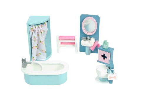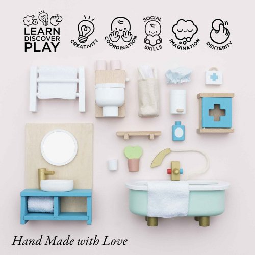 Tradiční a barevná sada nábytku a vybavení koupelny ze dřeva. Bude se perfektně hodit do dětských domečků pro panenky. Šest kusů nábytku a doplňky – vana, toaleta, umyvadlo, věšák na ručníky, lékárnička. Sada nábytku v retro stylu je vyrobena eticky za použití udržitelných materiálů. Velikostně se hodí do domečků pro panenky od Le Toy Van, více doplňků domečků z řady Daisylane najdete na našem webu. Hračky s účelemVšechny hračky firmy Le Toy Van jsou vyrobeny s cílem – aby dlouho vydržely. Designovány s láskou zkušenými řemeslníky za použití etických praktik a udržitelných materiálů, které jsou laskavější k naší planetě. Hlavní vlastnosti: měřítko 1:12vyrobeno eticky z udržitelných materiálůtestováno dle nejpřísnějších standardůmalováno netoxickými barvami na bázi vodytrénuje komunikační dovednosti a koordinaciinspiruje ke kreativní a představivé hře Daisylane kolekce: Prestižní kolekce domečků pro panenky a doplňků firmy Le Toy Van. Před více než 25 lety zakladatel Georges navrhl svůj úplně první domeček pro panenky, stavební kámen této firmy. Vyrobeno eticky z udržitelných materiálů, dřevěné domečky pro panenky Daisylane jsou jedinečné a nebudou dětskou představivost držet zpátky. Rodinné dědictví, opravdová investice do hraní.