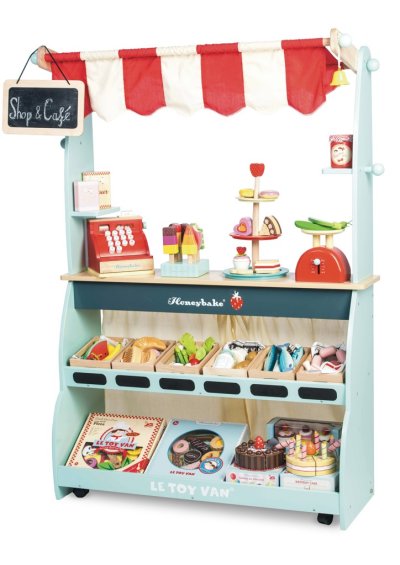 Skvělý a všemi oblíbený dřevěný prodejní pult vyhrál několik ocenění! Dětem poslouží jako obchod i kavárna, opravdu záleží jen na jejich představivosti. Pult 2 v 1 stačí otočit, na jedné straně má prodejní police, do kterých se vejdou bedýnky a produkty, na straně druhé prostor vhodný pro přípravu a servírování horkých nápojů. Nechybí ani oboustranná tabulka na křídu, textilní nákupní taška a zvoneček. Děti si při představivé hře procvičí nejen sociální dovednosti. Lze kombinovat s bedýnkami s jídlem od Le Toy Van. Hračky s účelemVšechny hračky firmy Le Toy Van jsou vyrobeny s cílem – aby dlouho vydržely. Designovány s láskou zkušenými řemeslníky za použití etických praktik a udržitelných materiálů, které jsou laskavější k naší planetě. Hlavní vlastnosti: vyrobeno eticky z udržitelného dřevatestováno dle nejpřísnějších standardůmalováno netoxickými barvami na bázi vodyinspiruje k představivé hřerozvíjí kognitivní dovednostikolečka pro jednoduchý transport Ocenění hračky:Junior Design Bronze Award 2017Good Toy Guide RecommendedRight Start Best Toy Award Winner 2017 Honeybake kolekce: Hračky v této kolekci jsou vhodné k objevování, pomohou dětem s rozvojem představivosti, sociálních a verbálních dovedností a kognitivních funkcí. Tradiční design s moderními detaily děti jistě bude bavit. Honeybake je kolekce Le Toy Van, která vyhrála nejvíce ocenění, a to za design, kvalitu, bezpečnost a také za vzdělávací a herní hodnotu.