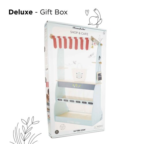 Skvělý a všemi oblíbený dřevěný prodejní pult vyhrál několik ocenění! Dětem poslouží jako obchod i kavárna, opravdu záleží jen na jejich představivosti. Pult 2 v 1 stačí otočit, na jedné straně má prodejní police, do kterých se vejdou bedýnky a produkty, na straně druhé prostor vhodný pro přípravu a servírování horkých nápojů. Nechybí ani oboustranná tabulka na křídu, textilní nákupní taška a zvoneček. Děti si při představivé hře procvičí nejen sociální dovednosti. Lze kombinovat s bedýnkami s jídlem od Le Toy Van.  Hračky s účelemVšechny hračky firmy Le Toy Van jsou vyrobeny s cílem – aby dlouho vydržely. Designovány s láskou zkušenými řemeslníky za použití etických praktik a udržitelných materiálů, které jsou laskavější k naší planetě. Hlavní vlastnosti: vyrobeno eticky z udržitelného dřevatestováno dle nejpřísnějších standardůmalováno netoxickými barvami na bázi vodyinspiruje k představivé hřerozvíjí kognitivní dovednostikolečka pro jednoduchý transport   Ocenění hračky:Junior Design Bronze Award 2017Good Toy Guide RecommendedRight Start Best Toy Award Winner 2017    Honeybake kolekce: Hračky v této kolekci jsou vhodné k objevování, pomohou dětem s rozvojem představivosti, sociálních a verbálních dovedností a kognitivních funkcí. Tradiční design s moderními detaily děti jistě bude bavit. Honeybake je kolekce Le Toy Van, která vyhrála nejvíce ocenění, a to za design, kvalitu, bezpečnost a také za vzdělávací a herní hodnotu.