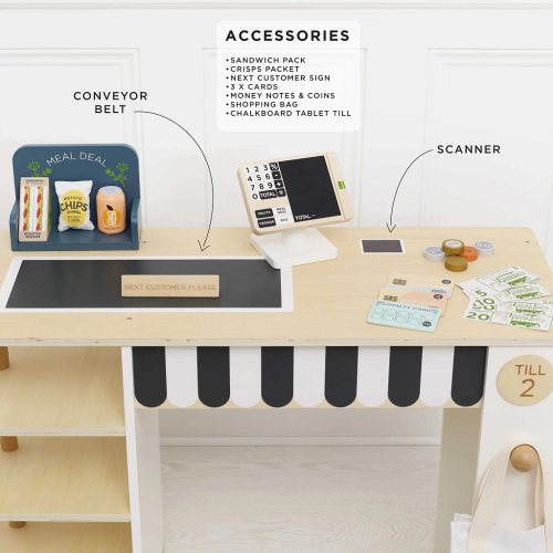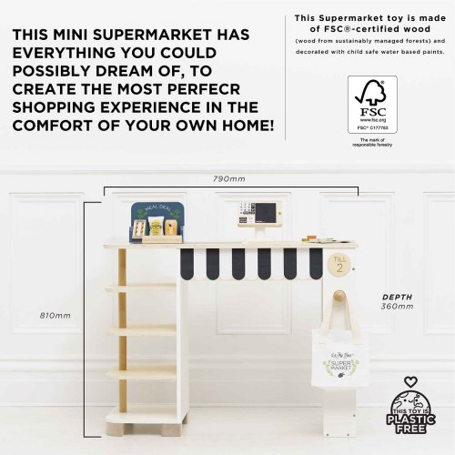 Tento prodejní stánek má vše, co si jen můžete přát, abyste si v pohodlí domova vytvořili perfektní nákupní zážitek. Součástí je regál, na který lze umístit různé potraviny. Dodáváno s kompletní sadou realistických potravin obsahující např. osvěžující plechovku nápoje, sáček lupínků, kečup, hořčici, těstoviny...což slibuje autentický zážitek z nakupování pro všechny, kteří rádi nakupují. Aby byl zážitek ještě zajímavější, je tu navíc elegantní pokladna, dále popisovací tabule, pásový dopravník, skener, hrací peníze, nápis "příští zákazník", křídová tabule se speciální nabídkou, bavlněná "taška na celý život" a platební, odměnové a věrnostní karty. Všechny díly jsou vyrobeny z udržitelných materiálů, včetně dřeva s certifikací FSC a přírodní bavlny. Sada je 100% bez plastu. Hračky s účelemVšechny hračky firmy Le Toy Van jsou vyrobeny s cílem – aby dlouho vydržely. Designovány s láskou zkušenými řemeslníky za použití etických praktik a udržitelných materiálů, které jsou laskavější k naší planetě. Hlavní vlastnosti: multifunkční, různorodé využitírozvíjí komunikační a sociální dovednosti dětívyrobeno ze dřeva s certifikací FSC®včetně bohatého příslušenství100% bez plastu Značka a certifikát FSC® (Forest Stewardship Council) zaručuje, že dřevo, ze kterého byl produkt vyroben, nebylo vytěženo nelegálně a pochází z lesů obhospodařovaných šetrným či přírodě blízkým způsobem, ve kterém jsou dodržovány přísné environmentální a sociální požadavky. Značka FSC® na výrobku znamená, že svým nákupem pomáháte chránit lesy a podporujete šetrné, odpovědné či přírodě blízké hospodaření, díky kterému jsou naše lesy stabilnější, zdravější, mají přirozenou druhovou skladbu a lépe odolávají negativním následkům klimatických změn. Honeybake kolekce: Hračky v této kolekci jsou vhodné k objevování, pomohou dětem s rozvojem představivosti, sociálních a verbálních dovedností a kognitivních funkcí. Tradiční design s moderními detaily děti jistě bude bavit. Honeybake je kolekce Le Toy Van, která vyhrála nejvíce ocenění, a to za design, kvalitu, bezpečnost a také za vzdělávací a herní hodnotu.