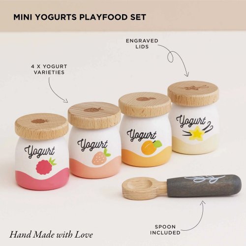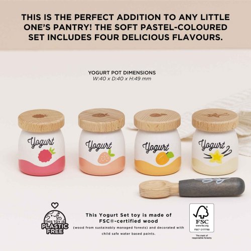 Zdravý start každého dne! Dřevěné hrací jídlo je skvělým způsobem, jak se děti seznámit s důležitostí zdravé a vyvážené stravy. Tato sada obsahuje čtyři dřevěné makety jogurtů s příchutí broskve, vanilky, maliny, jahody a jednu dřevěnou lžičku. Sada je vhodná také jako dárek. Podporuje rozvoj sociálních dovedností, inspiruje k nápadité hře a pomáhá zdokonalovat jemnou motoriku. Vyrobeno ze dřeva s certifikací FSC® (z lesů obhospodařovaných udržitelným způsobem), dekorováno netoxickými barvami na bázi vody, které jsou bezpečné pro děti.Hračky s účelemVšechny hračky firmy Le Toy Van jsou vyrobeny s cílem – aby dlouho vydržely. Designovány s láskou zkušenými řemeslníky za použití etických praktik a udržitelných materiálů, které jsou laskavější k naší planetě. Hlavní vlastnosti: vyrobeno z dřeva s certifikátem FSC®malováno netoxickými barvami na bázi vodytestováno dle nejpřísnějších standardůobsahuje 4 jogurty a jednu lžičkuhračka bez plastů Značka a certifikát FSC® (Forest Stewardship Council) zaručuje, že dřevo, ze kterého byl produkt vyroben, nebylo vytěženo nelegálně a pochází z lesů obhospodařovaných šetrným či přírodě blízkým způsobem, ve kterém jsou dodržovány přísné environmentální a sociální požadavky. Značka FSC® na výrobku znamená, že svým nákupem pomáháte chránit lesy a podporujete šetrné, odpovědné či přírodě blízké hospodaření, díky kterému jsou naše lesy stabilnější, zdravější, mají přirozenou druhovou skladbu a lépe odolávají negativním následkům klimatických změn.