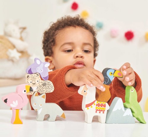 S touto hračkou děti čeká velké dobrodružství! Senzorická skládačka se zvířaty z pohoří And je vyrobena udržitelně, z pevného kaučukového dřeva, malována netoxickými barvami, které se neloupou. V bavlněném pytlíku na šňůrku najdete osm dílků zvířat (lama, lenochod, plameňák, ještěrka, tukan, motýl...) a jeden dílek zasněžené hory. Všechny dílky jsou velikostně tak akorát pro dětské ruce. Děti si při hře procvičí jemnou motoriku a zručnost. Hračka je bez obsahu plastu a je také vhodná na cesty. Hračky s účelemVšechny hračky firmy Le Toy Van jsou vyrobeny s cílem – aby dlouho vydržely. Designovány s láskou zkušenými řemeslníky za použití etických praktik a udržitelných materiálů, které jsou laskavější k naší planetě. Hlavní vlastnosti: vyrobeno eticky z udržitelného dřevatestováno dle nejpřísnějších standardůmalováno netoxickými barvami na bázi vodyinspiruje k představivé hřerozvíjí kognitivní dovednostihračka bez obsahu plastubavlněný pytlík a 9 dílků Petilou kolekce: Kolekce pro nemluvňata a batolata od Le Toy Van obsahuje hlavně hmatové hračky, které mají nejmenším posloužit také jako učební prostředky. Kolekce je inspirována přírodou kolem nás a je navržena tak, aby rozvíjela smysly dětí pomocí rozdílných zvuků, textur, tvarů a hmotností. Děti tak od malička zapojí všechny své smysly. V kolekci najdete například skládačky, vkládačky, chodítka, … Značka a certifikát FSC® (Forest Stewardship Council) zaručuje, že dřevo, ze kterého byl produkt vyroben, nebylo vytěženo nelegálně a pochází z lesů obhospodařovaných šetrným či přírodě blízkým způsobem, ve kterém jsou dodržovány přísné environmentální a sociální požadavky. Značka FSC® na výrobku znamená, že svým nákupem pomáháte chránit lesy a podporujete šetrné, odpovědné či přírodě blízké hospodaření, díky kterému jsou naše lesy stabilnější, zdravější, mají přirozenou druhovou skladbu a lépe odolávají negativním následkům klimatických změn.