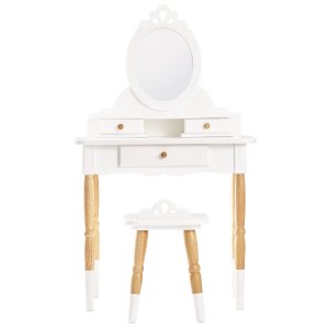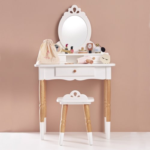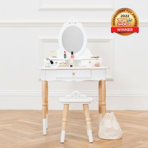 Krásný toaletní stolek v retro stylu, jistě naplní sny nejednoho dítěte. Bude se vyjímat v dětském pokoji nebo herně, je velmi elegantní a při hře opravdu upoutá pozornost dětí. Viktoriánské oválné zrcadlo z prvotřídního, nerozbitného akrylátu, dvoupatrový stolek, 3 šuplíky – perfektní pro skrytí pokladů a cetek. Vyrobeno týmem talentovaných hračkářů za použití udržitelného kaučukového dřeva, krásný kousek je vyroben s důrazem na detaily. Stůl i židle mají nohy zajímavého tvaru. Kombinace bílé a přírodního dřeva pro nadčasový vzhled. Krásný nábytek si můžete předávat z generace na generaci. Hlavní vlastnosti: toaletní stolek s židlípro děti od 3 do 6 letmaximální nosnost 50 kgvyrobeno eticky z udržitelného dřevamalováno netoxickými barvami na bázi vody Ocenění hračky:Independent Toy Gold Award Winner 2022 Honeybake kolekce: Hračky v této kolekci jsou vhodné k objevování, pomohou dětem s rozvojem představivosti, sociálních a verbálních dovedností a kognitivních funkcí. Tradiční design s moderními detaily děti jistě bude bavit. Honeybake je kolekce Le Toy Van, která vyhrála nejvíce ocenění, a to za design, kvalitu, bezpečnost a také za vzdělávací a herní hodnotu.