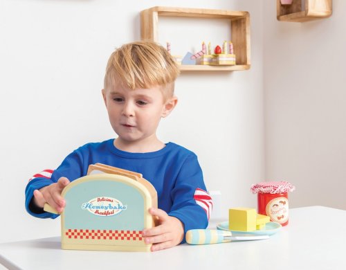 Dobré ráno, kdo si dá k snídani anglické tousty? Tato sada je perfektní pro představivou hru na role. V balení topinkovač s pružinami, z kterého vyskočí 2 krajíce toustového chleba, kousky másla se suchým zipem, sklenice džemu, nůž a talíř. Hračka je vyrobena z odolného a udržitelného dřeva, dětem podpoří v rozvoji sociálních dovedností, zručnosti a jemné motoriky. Hračky s účelemVšechny hračky firmy Le Toy Van jsou vyrobeny s cílem – aby dlouho vydržely. Designovány s láskou zkušenými řemeslníky za použití etických praktik a udržitelných materiálů, které jsou laskavější k naší planetě. Hlavní vlastnosti: vyrobeno eticky z udržitelného dřevatestováno dle nejpřísnějších standardůmalováno netoxickými barvami na bázi vodyinspiruje k představivé hřerozvíjí kognitivní dovednosti Honeybake kolekce: Hračky v této kolekci jsou vhodné k objevování, pomohou dětem s rozvojem představivosti, sociálních a verbálních dovedností a kognitivních funkcí. Tradiční design s moderními detaily děti jistě bude bavit. Honeybake je kolekce Le Toy Van, která vyhrála nejvíce ocenění, a to za design, kvalitu, bezpečnost a také za vzdělávací a herní hodnotu.