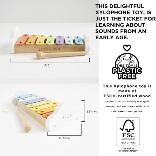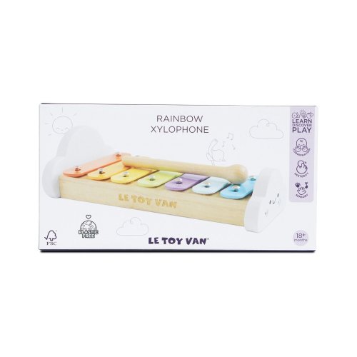 Podpořte zájem o hudbu u svých dětí s touto nádhernou xylofonovou hračkou! Je nejen vstupenkou pro poznávání světa zvuků a melodií od raného věku, ale také pomáhá malým hudebníkům procvičovat obratnost a zlepšovat tak uchopovací dovednosti. Hračka obsahuje i paličku. Je zkrášlena jemnými duhovými barvami a designem s roztomilými mráčky. Xylofon je vyroben ze dřeva s certifikací FSC® (dřevo z lesů obhospodařovaných udržitelným způsobem) a ozdoben barvami na vodní bázi bezpečnými pro děti. Hračky s účelemVšechny hračky firmy Le Toy Van jsou vyrobeny s cílem – aby dlouho vydržely. Designovány s láskou zkušenými řemeslníky za použití etických praktik a udržitelných materiálů, které jsou laskavější k naší planetě. Hlavní vlastnosti: vyrobeno eticky z udržitelného dřevatestováno dle nejpřísnějších standardůmalováno netoxickými barvami na bázi vodyrozvíjí talent dětí, cit pro rytmus a melodii Petilou kolekce: Kolekce pro nemluvňata a batolata od Le Toy Van obsahuje hlavně hmatové hračky, které mají nejmenším posloužit také jako učební prostředky. Kolekce je inspirována přírodou kolem nás a je navržena tak, aby rozvíjela smysly dětí pomocí rozdílných zvuků, textur, tvarů a hmotností. Děti tak od malička zapojí všechny své smysly. V kolekci najdete například skládačky, vkládačky, chodítka, … Značka a certifikát FSC® (Forest Stewardship Council) zaručuje, že dřevo, ze kterého byl produkt vyroben, nebylo vytěženo nelegálně a pochází z lesů obhospodařovaných šetrným či přírodě blízkým způsobem, ve kterém jsou dodržovány přísné environmentální a sociální požadavky. Značka FSC® na výrobku znamená, že svým nákupem pomáháte chránit lesy a podporujete šetrné, odpovědné či přírodě blízké hospodaření, díky kterému jsou naše lesy stabilnější, zdravější, mají přirozenou druhovou skladbu a lépe odolávají negativním následkům klimatických změn.
