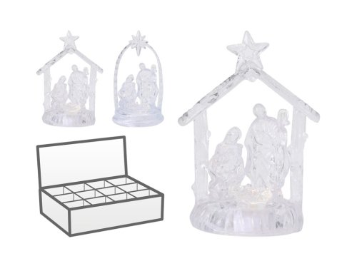 Dekorační LED betlém z plastu o rozměru 70×110 mm v čirém provedení. Jednotlivé varianty jsou dodávány v mixu a mohou se lišit drobnými detaily zpracování.