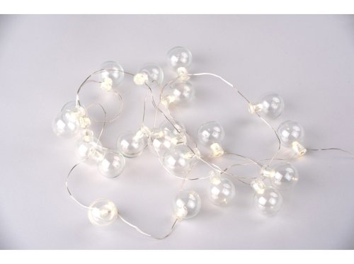 ento LED řetěz s 20 diodami ve skleněných kuličkách a teplým bílým světlem je ideální pro interiérové dekorace, aranžmá a vánoční výzdobu. LED světla vytvářejí hřejivou a příjemnou atmosféru. Řetěz je lehký a snadno se umisťuje či zavěšuje. Elegantní a praktické řešení pro stylové a útulné prostředí.