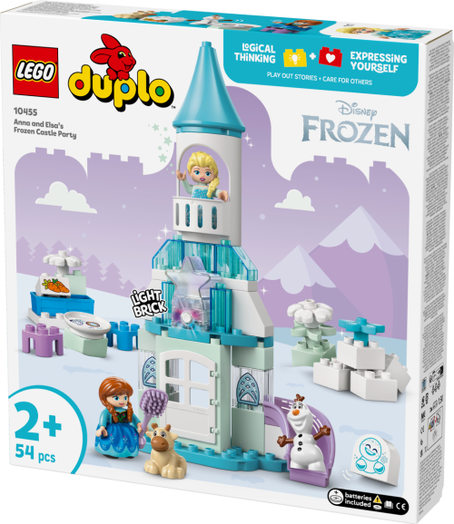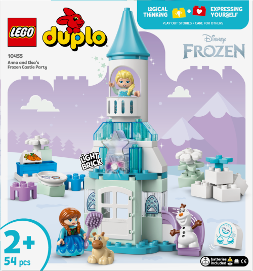 Ponořte se se svými ratolestmi do světa kreativního hraní se stavebnicí LEGO® DUPLO® - Disney (10455) Ledové království: Anna a Elsa a oslava na hradě pro batolata. Součástí jsou postavy LEGO DUPLO - Disney Elsy, Anny, sněhuláčka Marshmallowa, malého Svena a Olafa, se kterými si děti užijí nekonečné možnosti hraní na život na hradě a péči o malého Svena. Při stavění modelu hradu si malé děti procvičí jemnou motoriku. Tato fantasy stavebnice obsahuje doplňky, které malé děti i dospělé inspirují k zábavnému hraní na péči o mládě soba, při kterém zapojí fantazii. Tato vzdělávací stavebnice pro malé děti se pyšní řadou detailů, které stimulují jejich smysly. Elsa a Anna mají oblečené látkové sukně, které jsou příjemné na dotek. Najdete tu i výklopné dveře, které mohou malé prstíky otevřít a prozkoumat tak interiér hradu z filmu Ledové království. Stavebnice obsahuje také barevnou světelnou kostku, která představuje polární záři. Součástí stavebnice je 54 dílků.