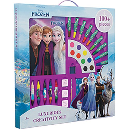 Set obsahuje 10 barevných fixů, 5 oboustranných voskovek, 9 vodovek, 3 pěnová razítka, sešit s omalovánkami, sešit se samolepkami, štětec, inkoustovou podušku a 3 obrázky k vystřihnutí.