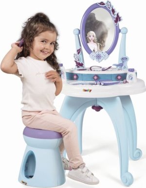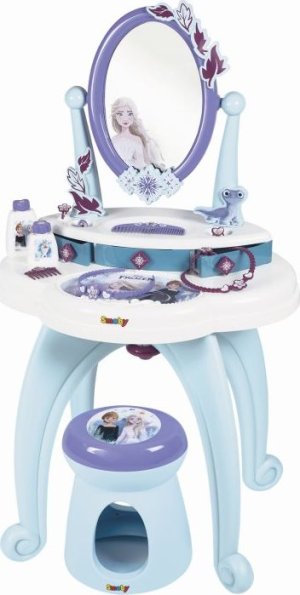 Robustní toaletní stolek se stoličkou a s velkým otočným zrcadlem je navržen v oblíbených barvách ledové královny Elsy a její sestry Anny. Součástí jsou lahvičky na parfémy, hřeben, čelenka, náhrdelník, hřeben do vlasů, náramek a 3 prsteny. Četné odkládací plochy jsou praktické a lze je využít k uložení veškerého příslušenství. Všechny použité materiály splňují nejvyšší požadavky na kvalitu pro dlouhou a bezstarostnou herní zábavu. Rozměry produktu (DxŠxV): 49 x 36 x 87 cm.
