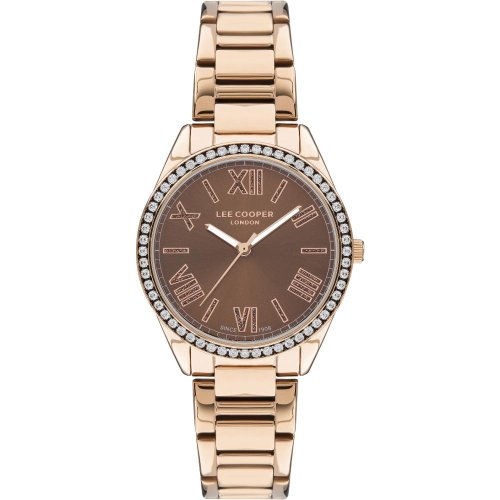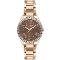 Dámské náramkové hodinky Napájení z baterie Průměr pouzdra 36,0 mm Pouzdro ve tvaru kruhu Kovové pouzdro Růžové zlato barva pouzdra Kovový tah Růžové zlato barva tahu Ručičkový ciferník Hnědá barva ciferníku Ciferník s dvanácti indexy Materiál skla - minerální sklo Odolné proti vodě při běžném nošení