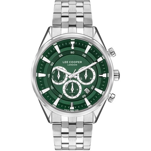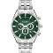Pánské náramkové hodinky Napájení z baterie Průměr pouzdra 44,0 mm Pouzdro ve tvaru kruhu Kovové pouzdro Stříbrná barva pouzdra Kovový tah Stříbrná barva tahu Ručičkový ciferník Zelená barva ciferníku Ciferník s dvanácti indexy Materiál skla - minerální sklo Odolné proti vodě během sprchování a mytí Datum Stopky Druhý čas