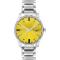 Pánské náramkové hodinky Napájení z baterie Průměr pouzdra 44,0 mm Pouzdro ve tvaru kruhu Kovové pouzdro Stříbrná barva pouzdra Kovový tah Stříbrná barva tahu Ručičkový ciferník Žlutá barva ciferníku Ciferník s dvanácti indexy Materiál skla - minerální sklo Odolné proti vodě při běžném nošení