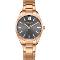 Dámské náramkové hodinky Napájení z baterie Průměr pouzdra 21,0 mm Pouzdro ve tvaru kruhu Kovové pouzdro Růžové zlato barva pouzdra Kovový tah Růžové zlato barva tahu Ručičkový ciferník Šedá barva ciferníku Ciferník s dvanácti indexy Materiál skla - minerální sklo Odolné proti vodě při běžném nošení