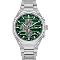 Pánské náramkové hodinky Napájení z baterie Průměr pouzdra 45,0 mm Pouzdro ve tvaru kruhu Kovové pouzdro Stříbrná barva pouzdra Kovový tah Stříbrná barva tahu Ručičkový ciferník Zelená barva ciferníku Ciferník s dvanácti indexy Materiál skla - minerální sklo Odolné proti vodě při běžném nošení