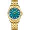 Dámské náramkové hodinky Napájení z baterie Průměr pouzdra 35,0 mm Pouzdro ve tvaru kruhu Kovové pouzdro Zlatavá barva pouzdra Kovový tah Zlatavá barva tahu Ručičkový ciferník Zelená barva ciferníku Ciferník s dvanácti indexy Materiál skla - minerální sklo Odolné proti vodě při běžném nošení