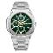 Pánské náramkové hodinky Napájení z baterie Průměr pouzdra 45,0 mm Pouzdro ve tvaru kruhu Kovové pouzdro Stříbrná barva pouzdra Kovový tah Stříbrná barva tahu Ručičkový ciferník Zelená barva ciferníku Ciferník s dvanácti indexy Materiál skla - minerální sklo Odolné proti vodě při běžném nošení