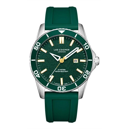 Pánské náramkové hodinky Napájení z baterie Průměr pouzdra 42,0 mm Pouzdro ve tvaru kruhu Kovové pouzdro Stříbrná barva pouzdra Zelená barva tahu Ručičkový ciferník Zelená barva ciferníku Ciferník s dvanácti indexy Materiál skla - minerální sklo Odolné proti vodě při běžném nošení