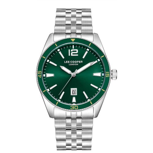 Pánské náramkové hodinky Napájení z baterie Průměr pouzdra 42,0 mm Pouzdro ve tvaru kruhu Kovové pouzdro Stříbrná barva pouzdra Kovový tah Stříbrná barva tahu Ručičkový ciferník Zelená barva ciferníku Ciferník s dvanácti indexy Materiál skla - minerální sklo Odolné proti vodě při běžném nošení