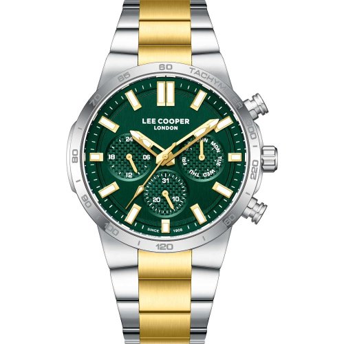 Pánské náramkové hodinky Napájení z baterie Průměr pouzdra 43,0 mm Pouzdro ve tvaru kruhu Kovové pouzdro Stříbrná barva pouzdra Kovový tah Stříbrná/zlatá barva tahu Ručičkový ciferník Zelená barva ciferníku Ciferník s dvanácti indexy Materiál skla - minerální sklo Odolné proti vodě při běžném nošení