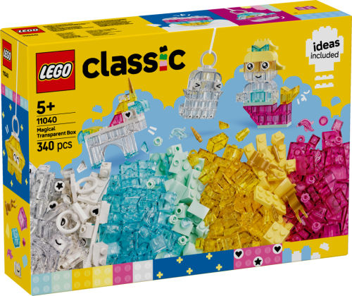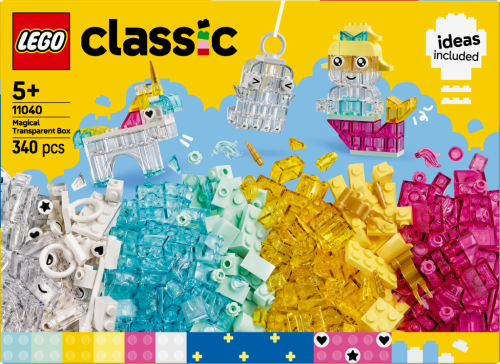 Užijte si nekonečnou kreativní zábavu se stavebnicí LEGO® Classic (11040) Kouzelná průhledná krabička. Tato výstavní stavebnice se skládá z 340 barevných kostek, z nichž je spousta průhledných, a speciálních dílků, které inspirují děti k tvoření. Těšit se můžete na kouzelné modely a nekonečné nápadité hraní!