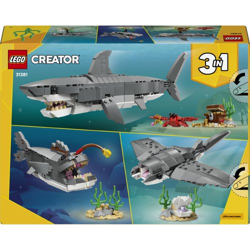 LEGO® 31381 Creator 3v1 Divoký žralok a truhla s pokladem je stavebnice určená pro děti od 8 let, která nabízí trojici modelů inspirovaných podmořským světem. Sada obsahuje celkem 379 dílků, z nichž lze sestavit pohyblivého žraloka s realistickými detaily jako jsou zuby, oči a ploutve, a to vše v kombinaci s malou truhlou s pokladem, mořskými rostlinami a červeným krabem. Díky konstrukci na podstavci je možné model vystavit jako dekoraci, čímž se zvyšuje jeho atraktivita i pro sběratele a nadšence do mořských tvorů.