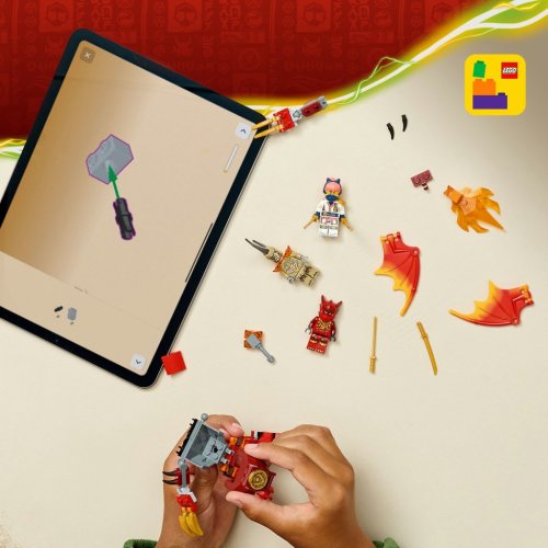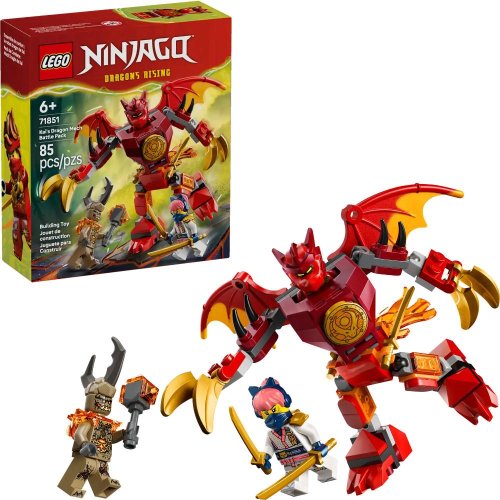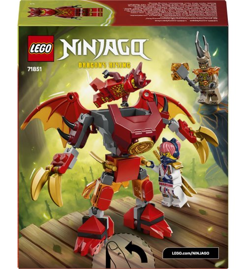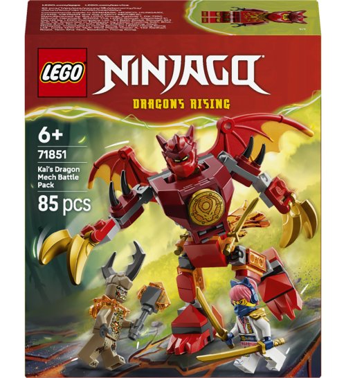 Kluci, holky a všichni fanoušci seriálu NINJAGO® Dračí povstání od 6 let si užijí hodiny kreativní zábavy se stavebnicí LEGO® NINJAGO Kaiův bojový balíček s dračím oblekem (71851). Tato stavebnice obsahuje dračí robotický oblek s pohyblivýma nohama, velkými křídly a rukama s drápy. Horní část těla lze otáčet o 360 stupňů a do kokpitu lze umístit minifigurku. Tato parádní nindžovská hračka obsahuje také 3 minifigurky: Kaie vyzbrojeného 2 meči, Soru se 2 meči a pozemskou příšeru s drápy, díky kterým si děti užijí hodiny dobrodružství při přehrávání scén ze 4. řady seriálu NINJAGO Dračí povstání. Řada stavebnic a dobrodružných hraček LEGO NINJAGO pro děti obsahuje propracované robotické obleky, draky a chrámy, se kterými se fanoušci vydají na úžasná akční dobrodružství s nindži. Aplikace LEGO Builder dodává dětem při stavění jistotu – můžou přibližovat a otáčet modely ve 3D a sledovat postup pomocí srozumitelného digitálního návodu. Stavebnice obsahuje 85 dílků.
