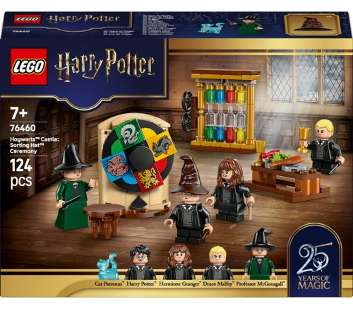 Postavte si stavebnici Bradavický hrad: Ceremoniál s Moudrým kloboukem z filmu Harry Potter a Kámen mudrců s touto stavebnicí k 25. výročí řady LEGO® Harry Potter Zahrajte si na ceremoniál s moudrým kloboukem s profesorkou McGonagallovou, Harrym Potterem, Hermionou Grangerovou a Dracem Malfoyem, kteří mají vlastní hůlky Nasaďte studentům na hlavu moudrý klobouk a otočte kolečkem, abyste zjistili, do které koleje budou zařazeni: Nebelvír, Zmijozel, Mrzimor nebo Havraspár Vymýšlejte příběhy s patronem v podobě kočky, který je součástí kolekce patronů k 25. výročí řady LEGO® Harry Potter (prodávají se samostatně) Dále se stolem plným jídla a počitadlem bodů pro jednotlivé koleje