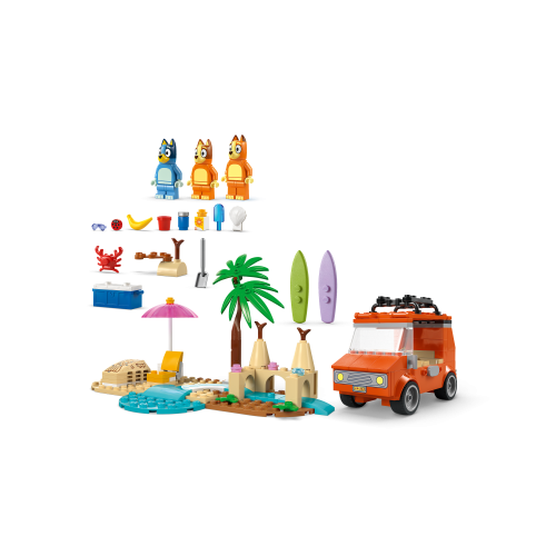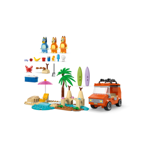 Tato stavebnice LEGO® obsahuje milované vozidlo z televizního seriálu Bluey se 2 surfovacími prkny připevněnými na střeše a kufrem na uložení chladicího boxu. Vyklápěcí střecha auta umožňuje dětem snadný přístup do interiéru, kde jsou sedadla pro minifigurky Bluey, Bingo a Chilli (maminky Bluey). Mezi plážové prvky, které inspirují děti ke kreativnímu hraní, patří působivý hrad z písku, ocas mořské panny z písku, do kterého se vejde minifigurka, lehátko, slunečník a palma. Nechybí krab, zmrzlina, sluneční brýle a opalovací krém.