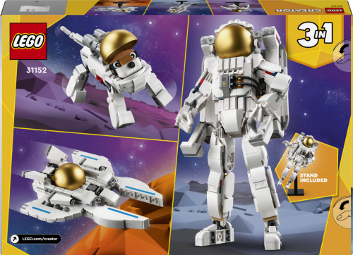 • 3 vesmírné hračky LEGO® v 1 krabici – Děti od 9 let, které milují vesmír, si se stavebnicí LEGO Creator 3 v 1 Astronaut postaví a přestaví 3 sady modelů ze stejných kostek• Nekonečné možnosti hraní ve vesmíru – Děti se vydají na odvážná dobrodružství mezi hvězdami se 3 různými vesmírnými modely: Figurkou astronauta, vesmírným psem a vesmírným Viperem• Pohyblivé vesmírné figurky – Model astronauta má pohyblivé nohy, chodidla, paže a prsty a vesmírný pes pohybuje ocasem a nohama a děti si je tak upraví podle vlastní fantazie• Výstavní modely – Každý ze 3 vesmírných modelů LEGO® má podstavec z kostek, aby si ho děti mohly vystavit v pokojíčku, až galaktické dobrodružství skončí• Narozeninový dárek s tematikou vesmíru – Tato stavebnice 3 v1 přináší stavitelský a herní zážitek. Představuje krásný dárek k narozeninám a děti si s ní užijí hodiny akčního hraní• Nový způsob stavění – Proveďte děti na jejich příštím stavitelském dobrodružství intuitivní aplikací s návodem LEGO® Builder. Umožn í jim ukládat si stavebnice, sledovat postup a přibližovat a otáčet modely ve 3D, zatímco na nich pracují• Hračky LEGO® Creator 3 v 1 – S každou ze stavebnic 3 v 1 si děti postaví 3 různé modely inspirované jejich zájmy, včetně zvířat, vozidel a propracovaných městských scén• Stavějte a hrajte si – Tato stavebnice LEGO® se skládá ze 647 dílků a součástí je model astronauta, který měří přes 27 cm na výšku