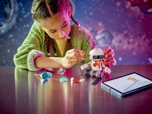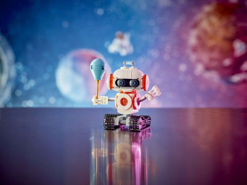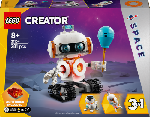Kluci a holky od 8 let si přehrají příběhy z hvězd s vědeckou stavebnicí LEGO® Creator 3 v 1 (31164) Vesmírný robot. Tento model robota pro děti má pohyblivé pásy a jetpack, otáčecí tělo a hlavu, pohyblivé paže a prsty, balón a světelnou kostku, která osvětluje jeho trup. Fanoušci LEGO můžou stavět a přestavovat 3 různé akční vesmírné modely ze stejných kostek: robota na pohyblivých pásech, pohyblivou figurku vesmírného psa s kostí a létajícím diskem nebo vesmírnou raketu. Všechny 3 modely představují parádní dárky s vesmírnou tematikou, se kterými si děti užijí spoustu zábavy. Stisknutím světelné kostky (baterie jsou součástí balení) děti model rozsvítí. Stavebnice LEGO Creator 3 v 1 představují skvělé dárky pro děti díky 3 různým možnostem stavění v každé krabici. Tyto stavebnice jsou součástí působivé řady, která potěší milovníky parádních vozidel, úžasných zvířat a propracovaných domů a malí stavitelé si s nimi vychutnají hodiny kreativního hraní. Upozorňujeme, že modely nelze sestavit najednou.