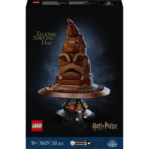 • Tip na dobrodružný filmový dárek pro dospělé – Vydejte se s do světa čar a kouzel s výstavním modelem LEGO® Harry Potter™ Mluvící Moudrý klobouk… který skutečně mluví • Zvuková kostka (baterie jsou součástí balení) – Dotkněte se špičky Moudrého klobouku nebo si ho položte na hlavu a aktivujte tak 1 z 31 zvuků v náhodném pořadí a zjistěte, na kterou kolej se podle klobouku hodíte • Podstavec na vystavení s minifigurkou Harryho Pottera – Podstavec na vystavení je zdobený erby Nebelvíru, Zmijozelu, Mrzimoru a Havraspáru a Harry má na hlavě vlastní Moudrý klobouk • Dárek s tematikou Harryho Pottera pro dospělé fanoušky – Udělejte radost sobě nebo tuto stavebnici čítající 561 dílků darujte k narozeninám nebo Vánocům milovníkům Harryho Pottera nebo sběratelům předmětů z kouzelnického světa • Ponořte se do stavění – Užijte si každý okamžik stavění s aplikací LEGO® Builder, která vám umožní přibližovat a otáčet modely ve 3D, sledovat svůj postup a ukládat všechny stavebnice na jednom místě • Sběratelské stavebnice LEGO® pro dospělé – Tato stavebnice LEGO Harry Potter je součástí kolekce prémiových stavebnic pro dospělé, kteří se rádi věnují kreativním projektům • Stavění, vystavování i hraní – Model LEGO® Harry Potter™ Mluvící Moudrýklobouk měří přes 24 cm na výšku a 19 cm v průměru