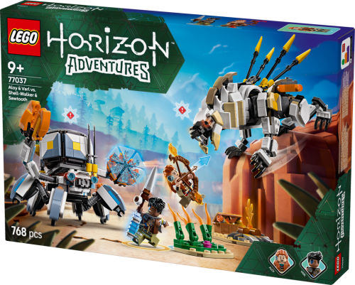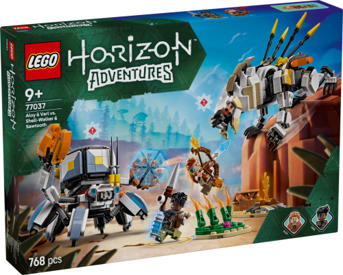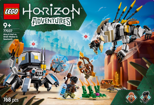 Stavebnice Aloy a Varl vs. Shell-Walker a Sawtooth je plná kreativní zábavy pro kluky a holky od 9 let, kteří milují videohru LEGO® Horizon Adventures Součástí je minifigurka Aloy držící luk a minifigurka Varla držící oštěp Obě mají vylepšení, která k nim lze přidat a umožnit tak různé způsoby útoku Děti se připojí k Aloy a Varlovi a budou společně bojovat proti 2 plně pohyblivým strojům, Shell-Walkerovi a Sawtoothovi, a vymění prvky na jejich zbraních, čímž aktivují útoky ohněm, šokem a chladem Modely strojů Horizon – Shell-Walker má štít, energetický modul, pohyblivé nohy a ruce a otevírací drápy a Sawtooth má otevírací čelisti, otáčející trup a pohyblivýkrk, hlavu a nohy