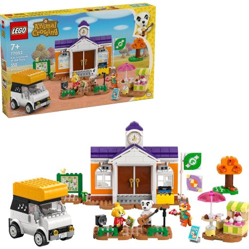 Holky a kluci ve věku od 7 let si se stavebnicí K.K. a koncert na náměstí (77052) vymyslí vlastní příběhy inspirované sérií videoher Animal Crossing™. Nejdříve si postaví scény z videohry a poté si mohou hrát se 3 minifigurkami LEGO® Animal Crossing a mnoha známými doplňky ze série těchto videoher, ať už je jejich představivost zavede kamkoli! Děti připraví koncert K.K. tak, že ze střechy karavanu přinesou jeho mikrofon, předstírají, že hrají na kytaru, nebo se připojí k Isabelle při skupinovém protahování. V kavárně si s Audie poví všechny novinky a pak se vydají na radnici, kde mohou získat vlastnoručně vyrobený leták s receptem, získat odměny v bankomatu a zkontrolovat krabici na tříděný odpad, jestli něco nepřibylo.