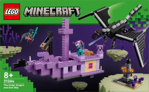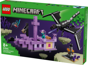 „Stavebnice LEGO® Minecraft® (21264) Drak z Enderu a loď z Endu je hračka plná oblíbených postav ze světa videohry Minecraft®, dračí akce a dobrodružství na palubě lodě. Model s drakem z Minecraftu poslouží jako ideální dárek pro děti od 8 let, které mají rády stavebnice pro objevitele. Hráči vstoupí do nebezpečného biomu End, kde se musí postavit drakovi z Enderu. Všechny končetiny této figurky s klouby jsou pohyblivé a upravitelné. Loď z Endu má plně vybavený interiér, do kterého vstoupíte skrz zvedací střechu a otevírací boční strany. Dračí hlavu z přídě lze odejmout a nosit ji jako přilbu. Uvnitř děti najdou varný stojan s lektvary zdraví. Mezi postavy z Minecraftu najdete průzkumníka Enderu s krovkami a ohňostrojovou raketou, rytíř z Enderu, Shulker a Enderman. Součástí je také cenné dračí vejce. Více digitální zábavy si stavitelé užijí s interaktivní aplikací LEGO® Builder, ve které mohou přibližovat a otáčet modely ve 3D a sledovat svůj pokrok.“