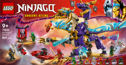 Potěšte kluky a holky od 9 let nindžovskou stavebnicí LEGO® NINJAGO® (71836) Drak soustředění Arc, se kterou si připomenou napínavé akční scény z 3. řady televizního seriálu NINJAGO Dračí povstání. Tato stavebnice obsahuje figurku dvouhlavého draka s pohyblivým ocasem, nohama, chodidly, hlavou, krkem, čelistí a drápy. Děti můžou aktivovat vystřelovač v jeho hrudi a pohybovat jeho velkými fóliovými křídly tam a zpět pomocí páky, která je umístěna na jeho zádech. Tato bojová stavebnice obsahuje 8 minifigurek postav NINJAGO, se kterými se fanoušci nindžů vydají na akční dobrodružství. Součástí je nindža válečník Lloyd, Cole, Wyldfyre a Kai a jejich spojenkyně Pixal, kteří mají nindžovské zbraně, a nechybí padouch Drix, Zarkt a dračí bojovník s vlastními zbraněmi. Součástí stavebnice LEGO je také parádní vozidlo Spinjitzu spinner, se kterým si děti užijí ještě více zábavy při hraní. Malí stavitelé dovnitř umístí minifigurku a stisknou tlačítko na odpalovači, který roztočí spinnery, a pak budou sledovat, jestli po zasažení cíle odletí 2 dílky síly.