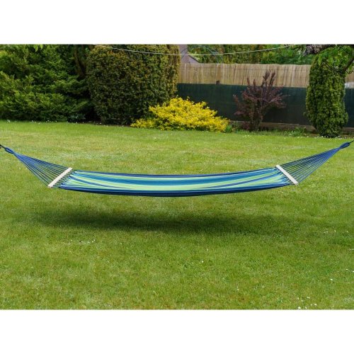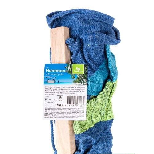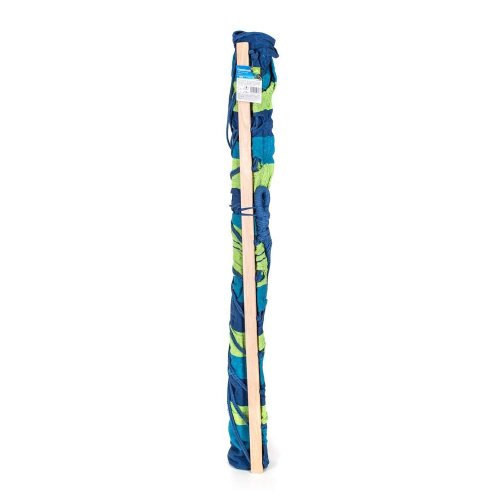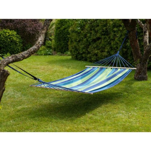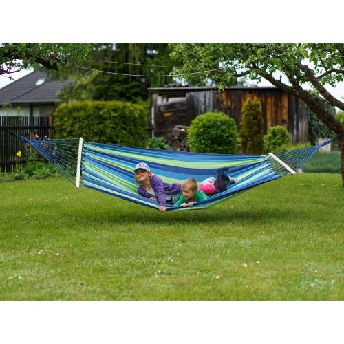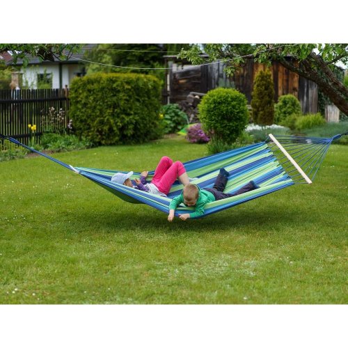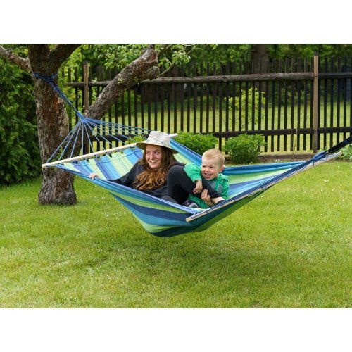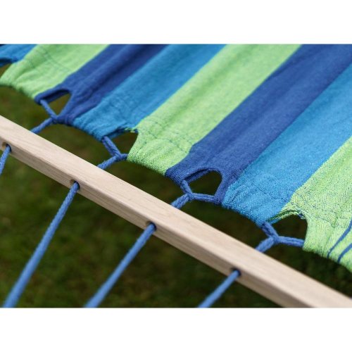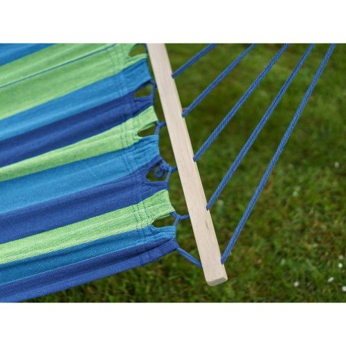 rozměry: 200 x 150 cm materiál: bavlna, polyester, dřevěné vzpěry barva: modro - zelená nosnost: 100 kg