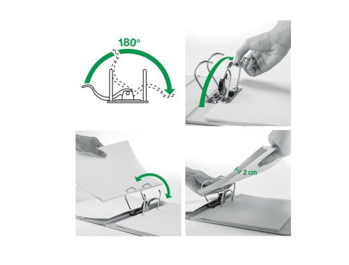 Unikátní páková mechanika s otevřením o 180°, která umožňuje o 50 % širší otevření a o 20 % rychlejší práci s pořadačem