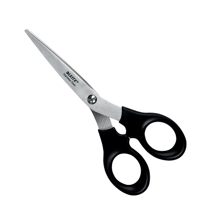 "Nůžky z nerezové oceli s ergonomickou rukojetí. Ideální pro všechny běžné úkoly při stříhání papíru doma, ve škole i v kanceláři. Na plastové závěsné kartě bez obsahu plastu.