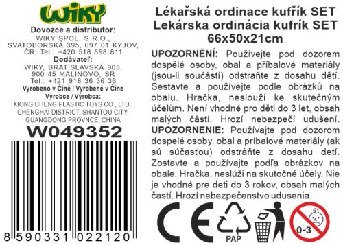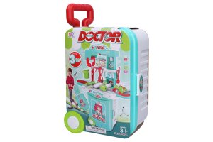 Lékařská ordinace kufřík. Velikost 38cm . Kufřík je na kolečkách a má vysunovací madlo. Výška s vysunutým madlem 55,5cm, výška se zasunutým madlem 38cm. Kufřík jde přestavět na lékařskou ordinaci o rozměrech: 66x50x21cm. Návod na sestavení na obale. Obsahuje brýle, nůžky, injekci, teploměr a další příslušenství.