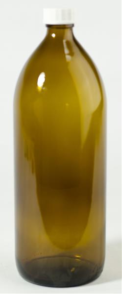 Lékovka úzkohrdlá s uzávěrem, hnědá; 1000 ml. materiál: sodno-draselné sklo, nelze autoklávovat.