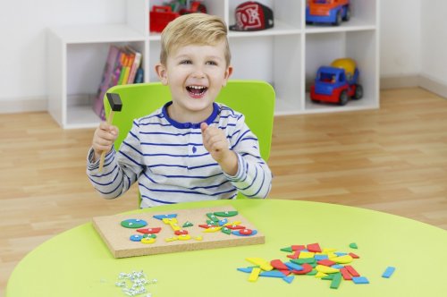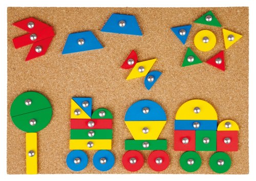 Tvůrčí zábava nikdy nekončí. S tímto kladívkem, dílky a korkovou deskou můžete vytvořit mnoho různých obrazců. Sada obsahuje: 72 barevných dílků v 9 tvarech, kladivo a hřebíky a korkovou desku: 27 x 20,5 cm. Hlavní vlastnosti: podporuje kreativitu a koncentracipodporuje jemnou motoriku