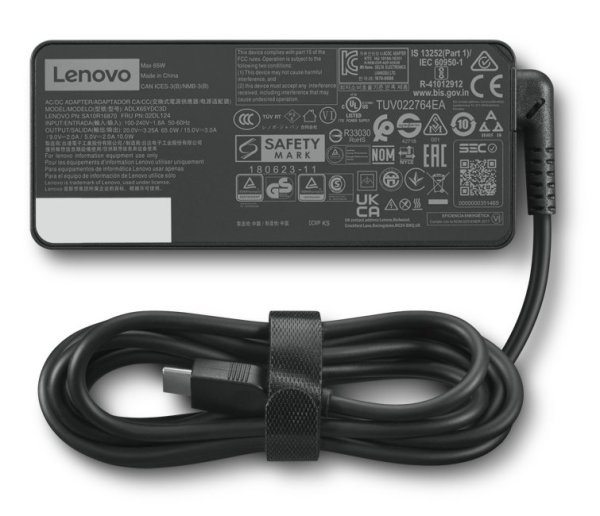 Napájecí adaptér s výkonem 65 W a konektorem USB-C pro notebooky Lenovo. Napájecí kabel do sítě je součástí balení.