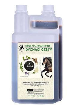 Bylinný Sirup Pulmoran Horse Dýchací cesty podporuje normální funkce dýchacího ústrojí koní. Byliny obsažené v sirupu napomáhají rozpouštění hlenů a odkašlávání. Použití sirupu je vhodné i jako preventivní ochrana. Vhodný pro koně trpící astmatem. Zmírňuje alergické reakce na prach a seno. Složení: cukr 59,21 %, vodný výluh z bylin (list šalvěje lékařské 5,92 %, kořen proskurníku 5,92 %, nať truskavce 5,92 %, nať tymiánu 5,92 %, nať kopřivy 5,92 %, plod fenyklu 3,94 %, květ černého bezu 1,97 %, list jitrocele 1,97 %, kořen lékořice 1,97 %), sorban draselný 0,49 %, benzoan sodný 0,42 %, kyselina citronová 0,39 %. Dávkování a způsob použití: dospělý kůň o hmotnosti 500 kg: 40 ml 1× denně. Dávku podávejte samostatně nebo přimíchejte do jadrného krmiva. Nepřekračujte uvedené dávkování. Před použitím protřepejte. Upozornění: Určeno pouze pro zvířata. Uchovávejte při teplotě do 25 °C, uzavřené v původním obalu. Po otevření spotřebujte do 30 dnů. Usazenina je přirozeným jevem a není na závadu.