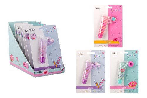 Lesk na rty Candy s přívěsky. Tři různá barevná provedení – tři příchutě – zmrzlina, donut a marshmallow.
