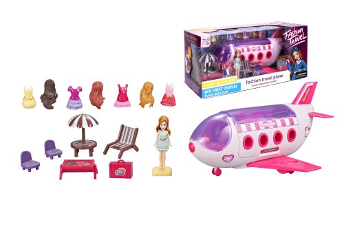 Letadlo s panenkou a příslušenstvím. Velikost letadla 28 cm. Balení obsahuje letadlo, panenku, zahradní nábytek s grilem, šaty a vlasy pro panenku.