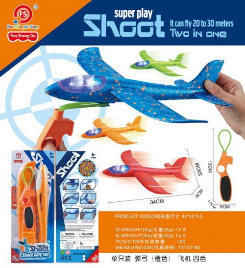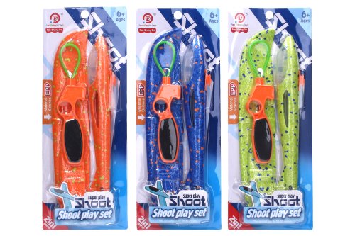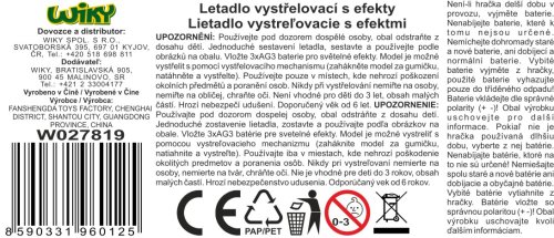 Letadlo vystřelovací s efekty. Rozměry 34x9x33 cm. Světelné efekty. 3xAG3 baterie jsou součástí balení. 4 varianty - modrá, zelená, oranžová, červená.